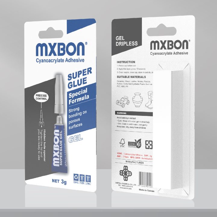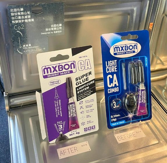 北回化學計畫於 2026 年第一季 正式將紙泡殼包裝導入生產線,預計首波導入 MXBON 消費型瞬間膠系列產品,逐步取代現行塑膠泡殼包裝。